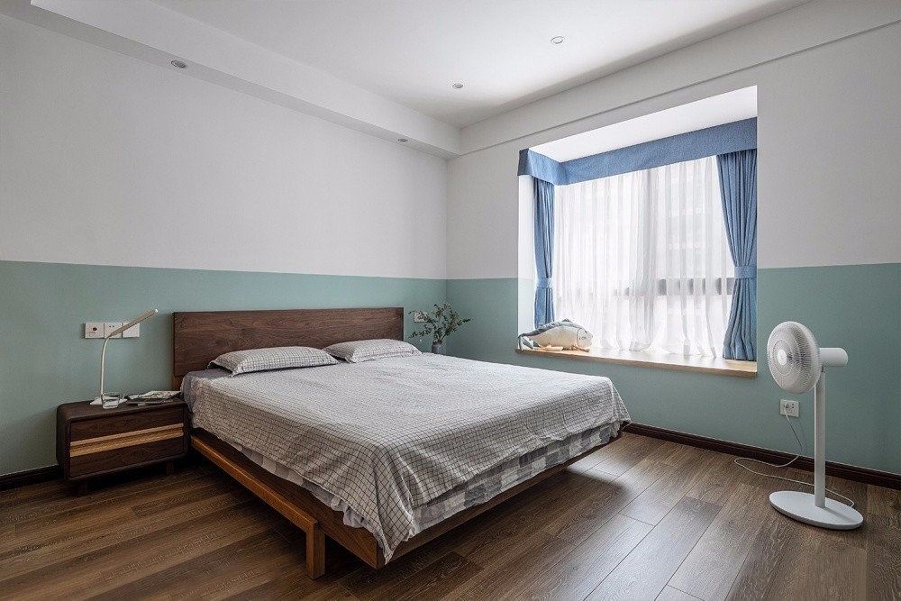 主臥墻面采用白色與淺綠色上下分色的涂刷效果,形成獨(dú)特的圍和感。簡潔舒適的灰調(diào)床品,營造寧靜安逸的睡眠氛圍。加入綠植的點綴,帶來清新自然的味道。