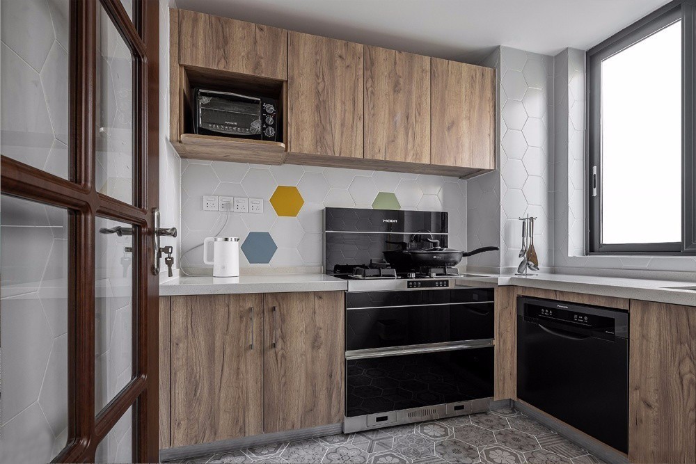 廚房墻面鋪設(shè)淺灰色六角磚,點綴藍(lán)色黃色與綠色,為空間增添了跳躍靈動感。與木質(zhì)櫥柜完美結(jié)合,簡約自然中透露著精致感。