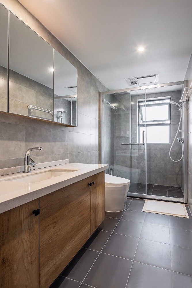 打通次衛(wèi)干濕分區(qū)的一堵墻,采用玻璃隔斷的設(shè)計,既不怎么占用空間,視覺上也變得很寬敞。超大的浴室柜真的很實用,大面積的鏡柜方便收納各種瓶瓶罐罐。: