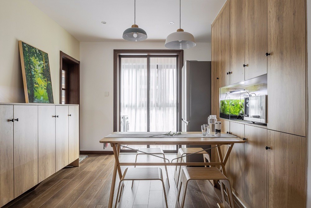 原木餐桌搭配簡單實用的紙片凳,簡約樸質(zhì)而又利落。餐邊柜中空的設(shè)計,方便以后添置使用各種家電,提升幸福感與實用度。廚房墻面鋪設(shè)淺灰色六角磚,點綴藍(lán)色黃色與綠色,為空間增添了跳躍靈動感。與木質(zhì)櫥柜完美結(jié)合,簡約自然中透露著精致感。