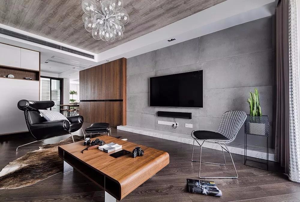 客廳,深色地板和水泥墻,突出了工業風的元素。水泥墻電視背景給生活帶來真實感,簡簡單單、不加修飾,實則蘊藏著與生俱來的原始美感。